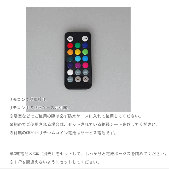 ● サイズ 本体: サイズ (W80 x D80 x H30 mm) リモコン サイズ (W86 x D40 x H7 mm) ●電源 本体:単3アルカリ電池(別売) リモコン:CR2025リチウムコイン電池(サービス電池付属) ●電池接続時間 約6.5時間(白色LED使用時) ●使用環境温度 10〜45℃ ●付属品 リモコン, 防水ケース, 取扱説明書 ●素材 体:ABS, PC リモコン:ABS 付属防水ケース:PVC ● キーワード バスライト アクアライト お風呂に沈めて使える防水カラフルLEDライト 13色調光 Aqua Light 癒し 照明 お洒落